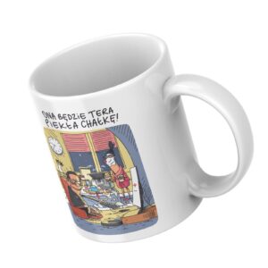 Do kolekcji nowości inspirowanych programem Rafała z trasy Pacześ x Lotek dołącza kubek. Zawiera zarówno grafikę (tę samą, która zdobi koszulkę Chałka) po jednej stronie kubka, jak i logo King of Entertainment pojemność 300 ml cylindryczny kształt można myć w zmywarce